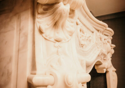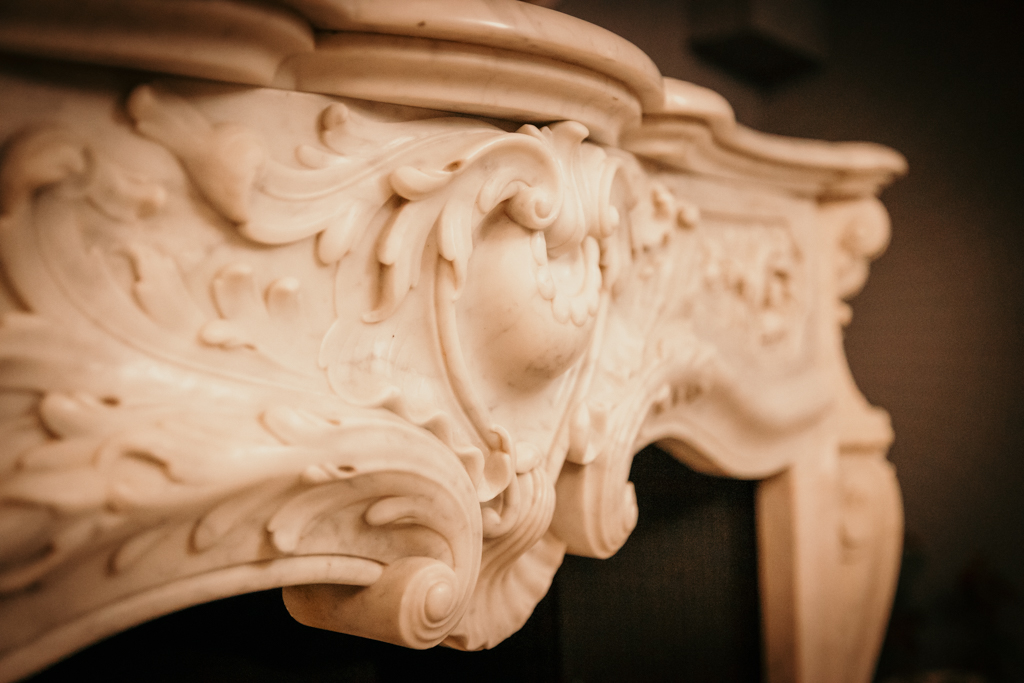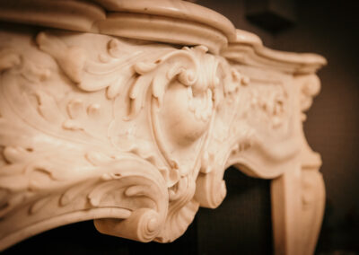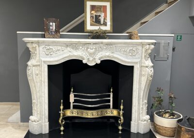 A French 18th century, Louis XV Rococo Fireplace surround, finely carved and detailed in white Carrara marble.